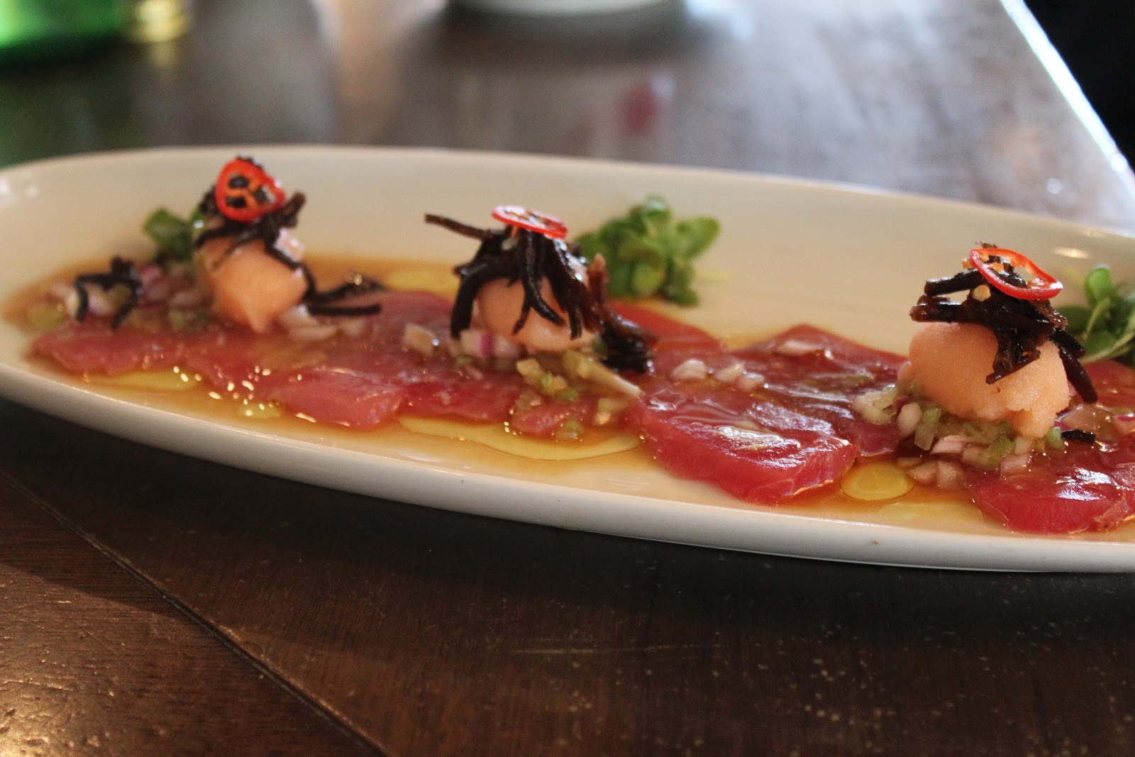 Ho assaggiato un tonno con gelato di Campari e una cupola di avocado e tartare di seriola.
