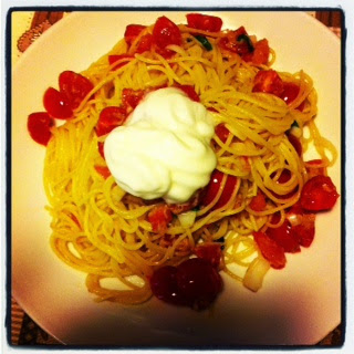Ho scelto di abbinarla ad un piatto semplice, genuino, autentico e di stagione come uno spaghetto con pomodorini e basilico fresco proprio per far esaltare al massimo il gusto della spuma al parmigiano.
