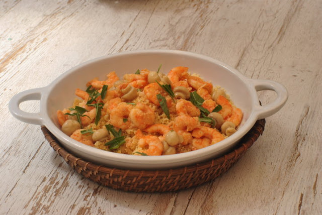 Cous cous che non manca mai nella mia dispensa, vasetto di funghi sott'olio che compro per i momenti "difficili" e un sacchetto di mazzancolle fresche e poi surgelate da me.